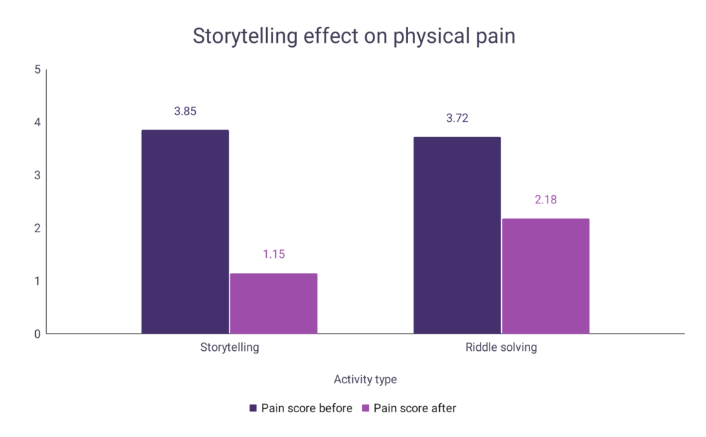 - Storytelling was shown to be much more effective at reducing pain when compared against the results of the control group.