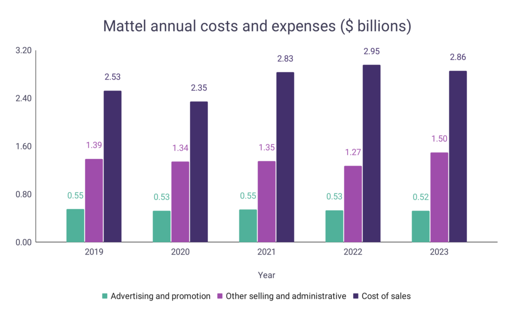 - Mattel’s total costs and expenses reached $4.88 billion in 2023, up 2.53% over the previous year.