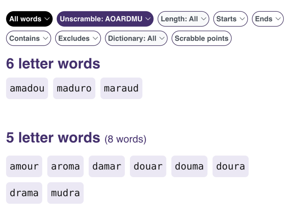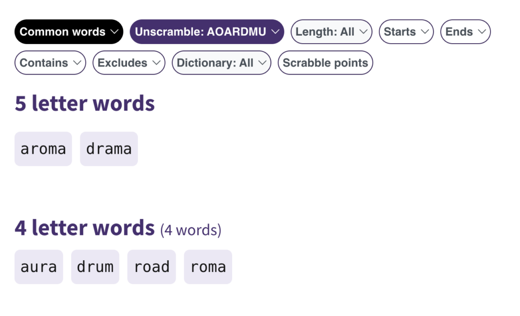 Similarly, the all words/ common words filter can be extremely useful. For example, you can see the letters “AOARDMU” make up three 6-letter words and eight 5-letter words.